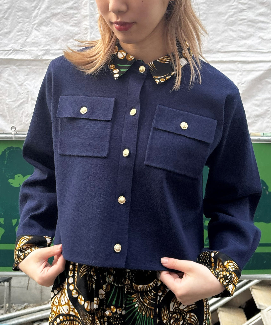 Shirt layered like knit cardigan