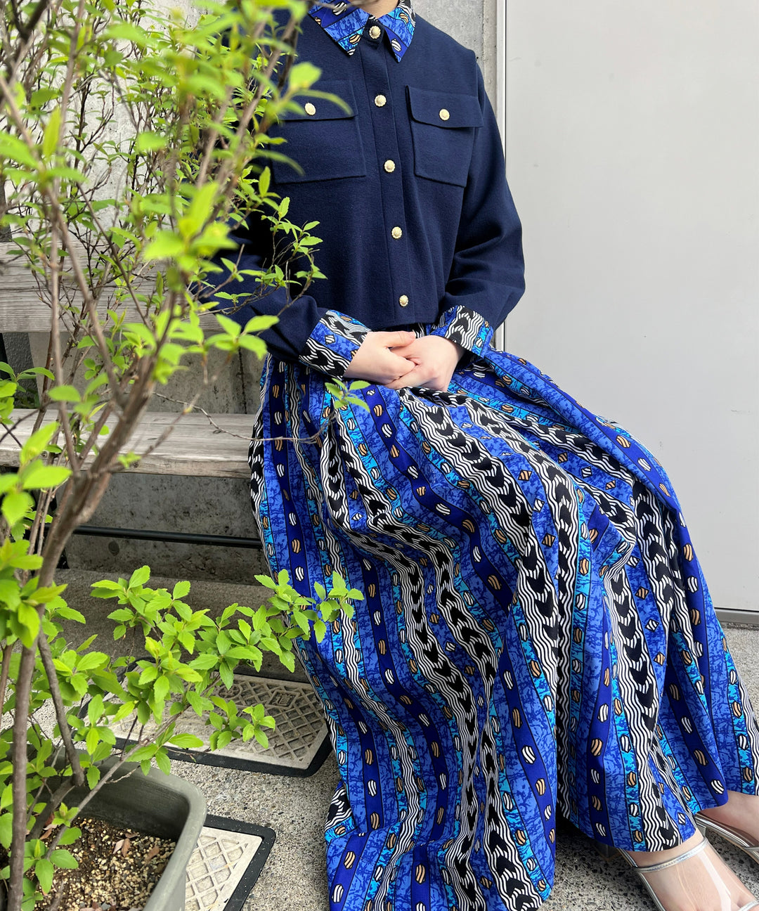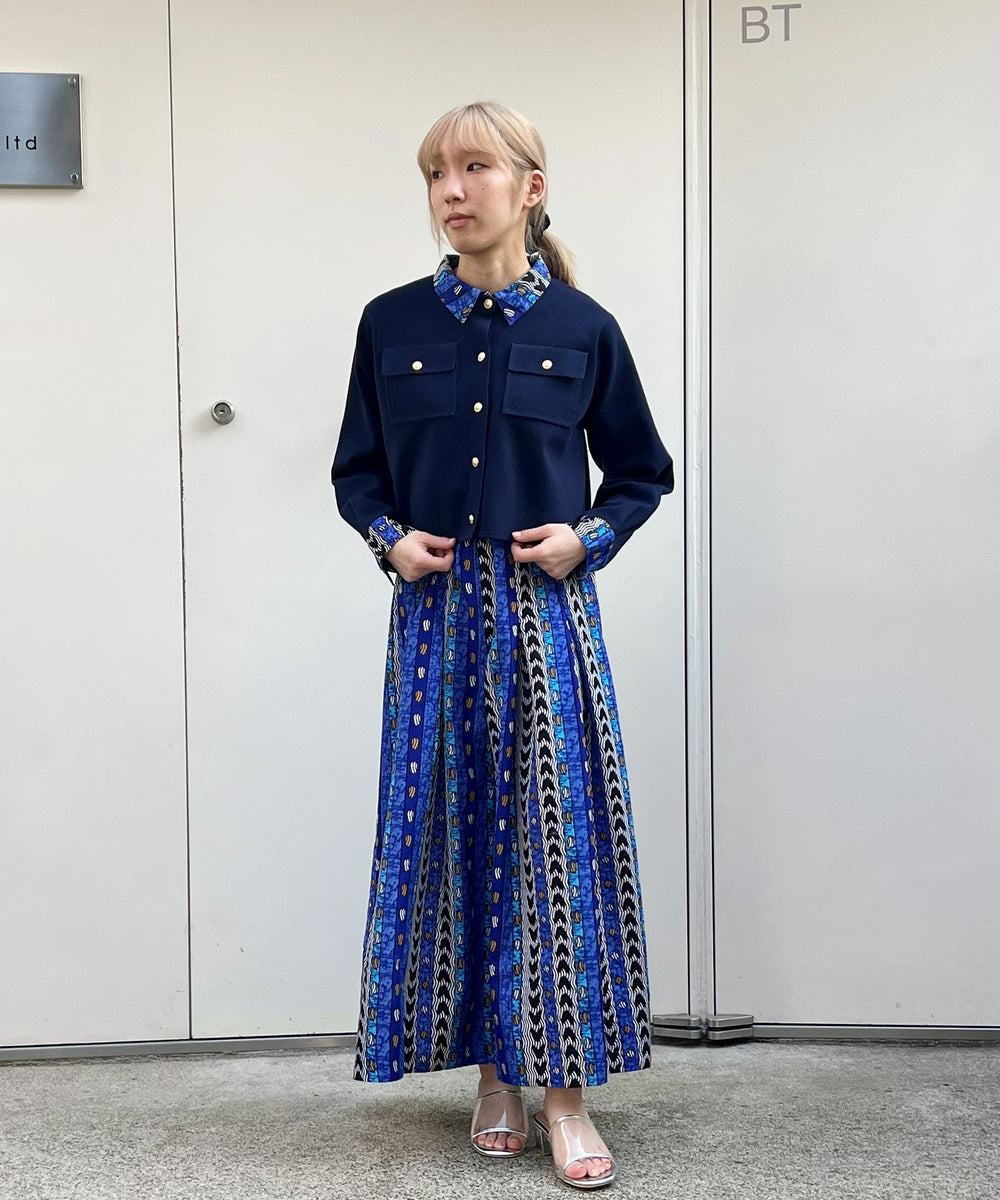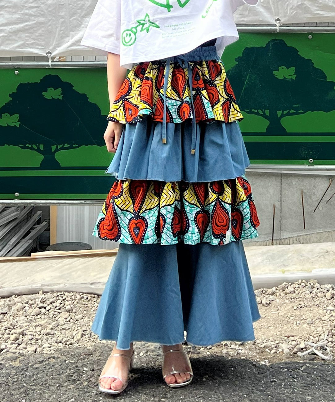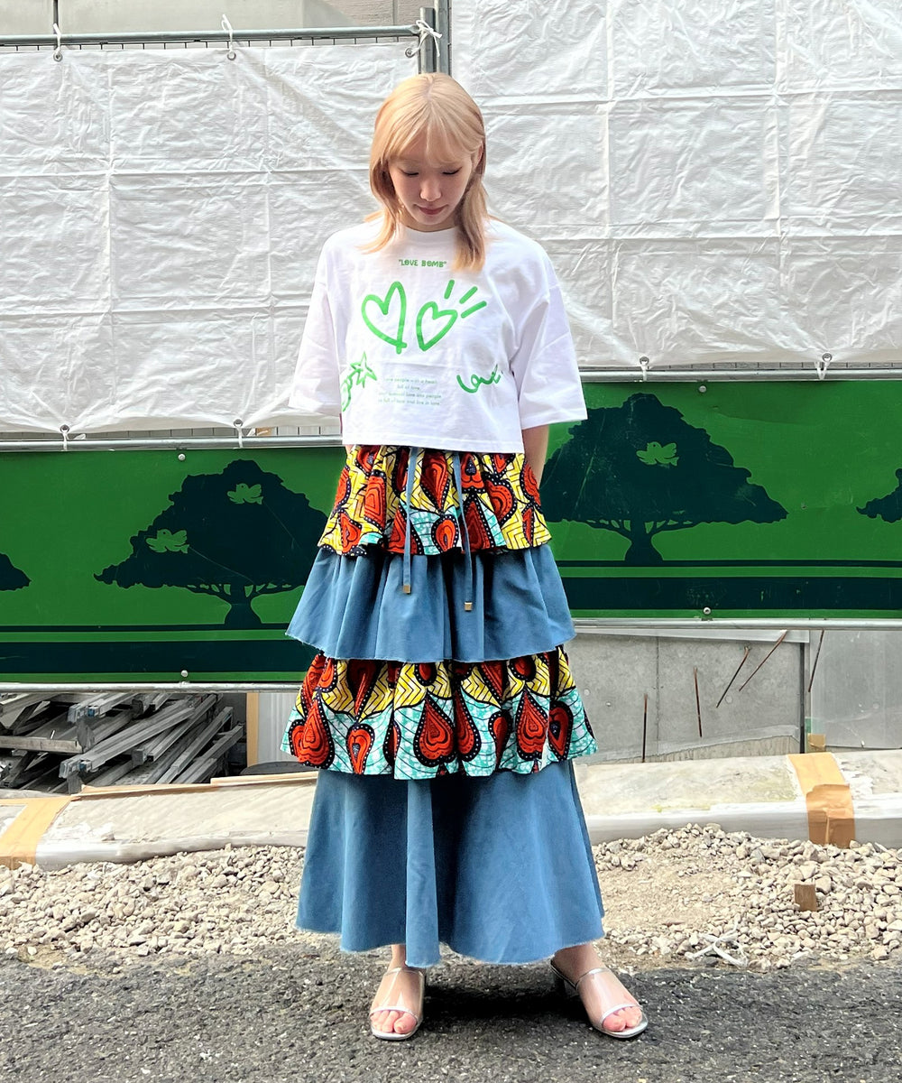 Denim × African fabric frill skirt