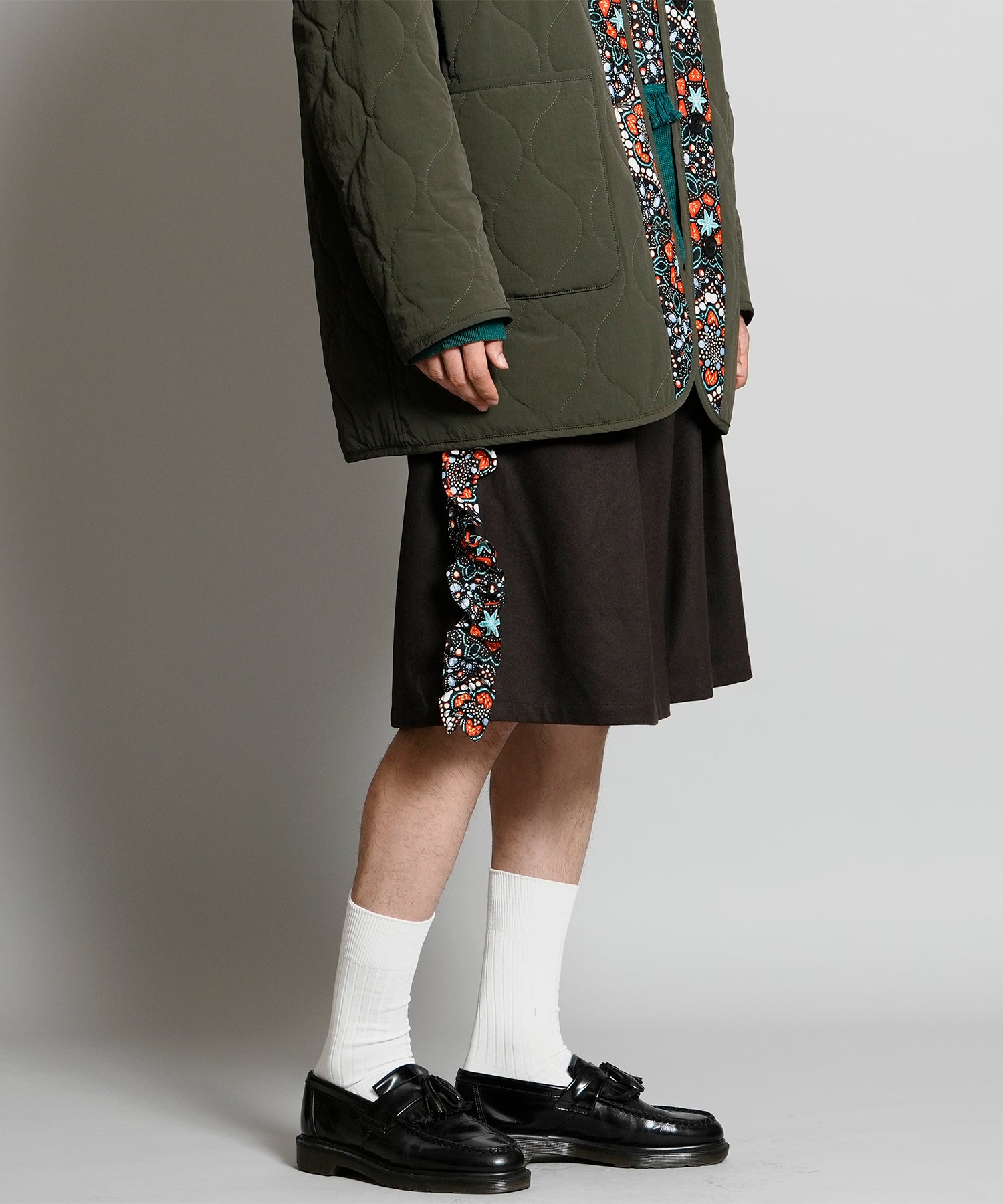 サイドのフリルにはナイジェリアのアフリカンファブリックを使用しており、フリルを着ければ個性をプラスすることができて、外せばシンプルなミドルパンツとしても様々なシーン、コーディネートにプラスできる万能アイテムです。