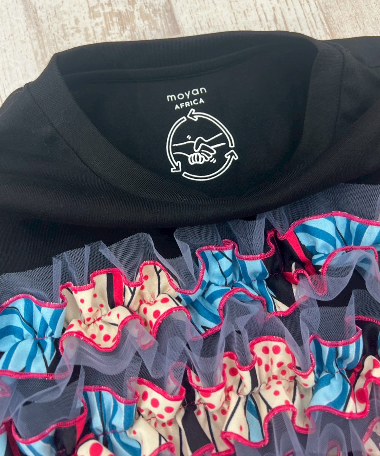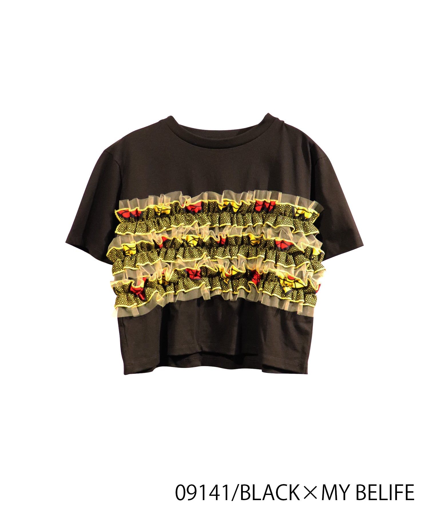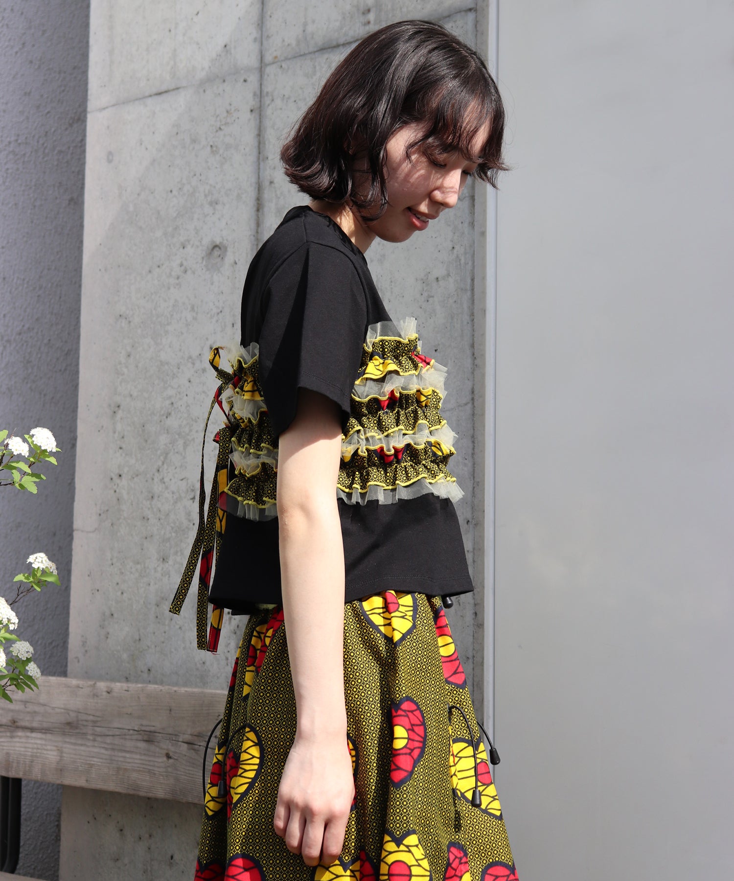 アフリカンファブリックにチュールを重ねて身頃にたたき付けていて、かわいさが詰まったこの夏にオススメのTシャツです!