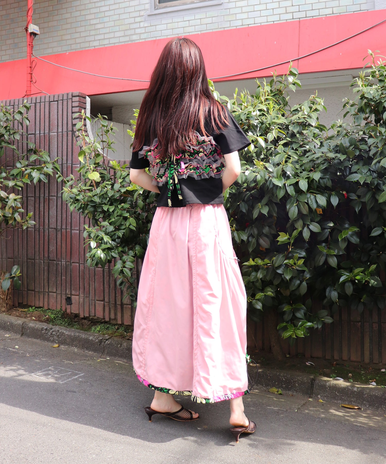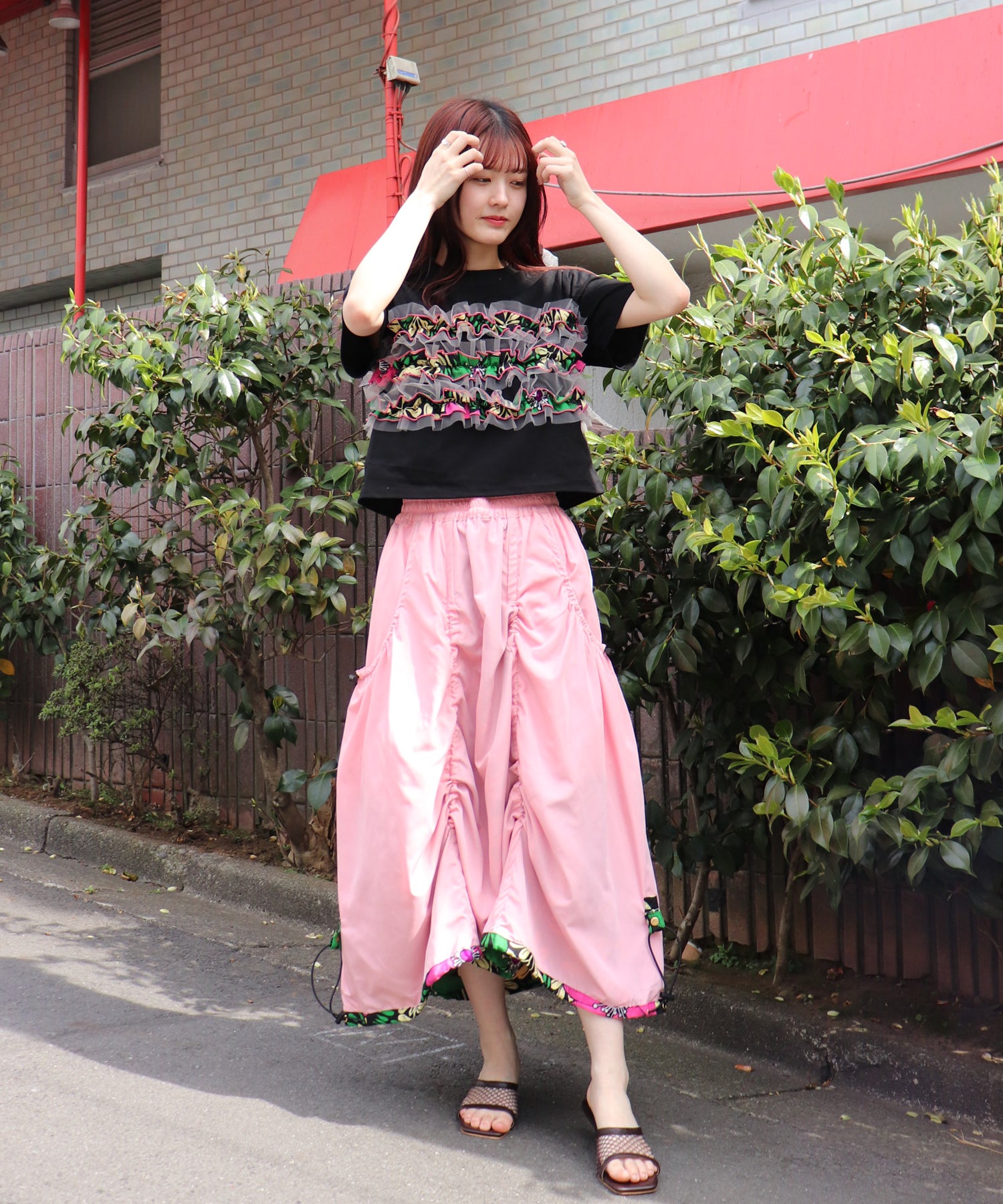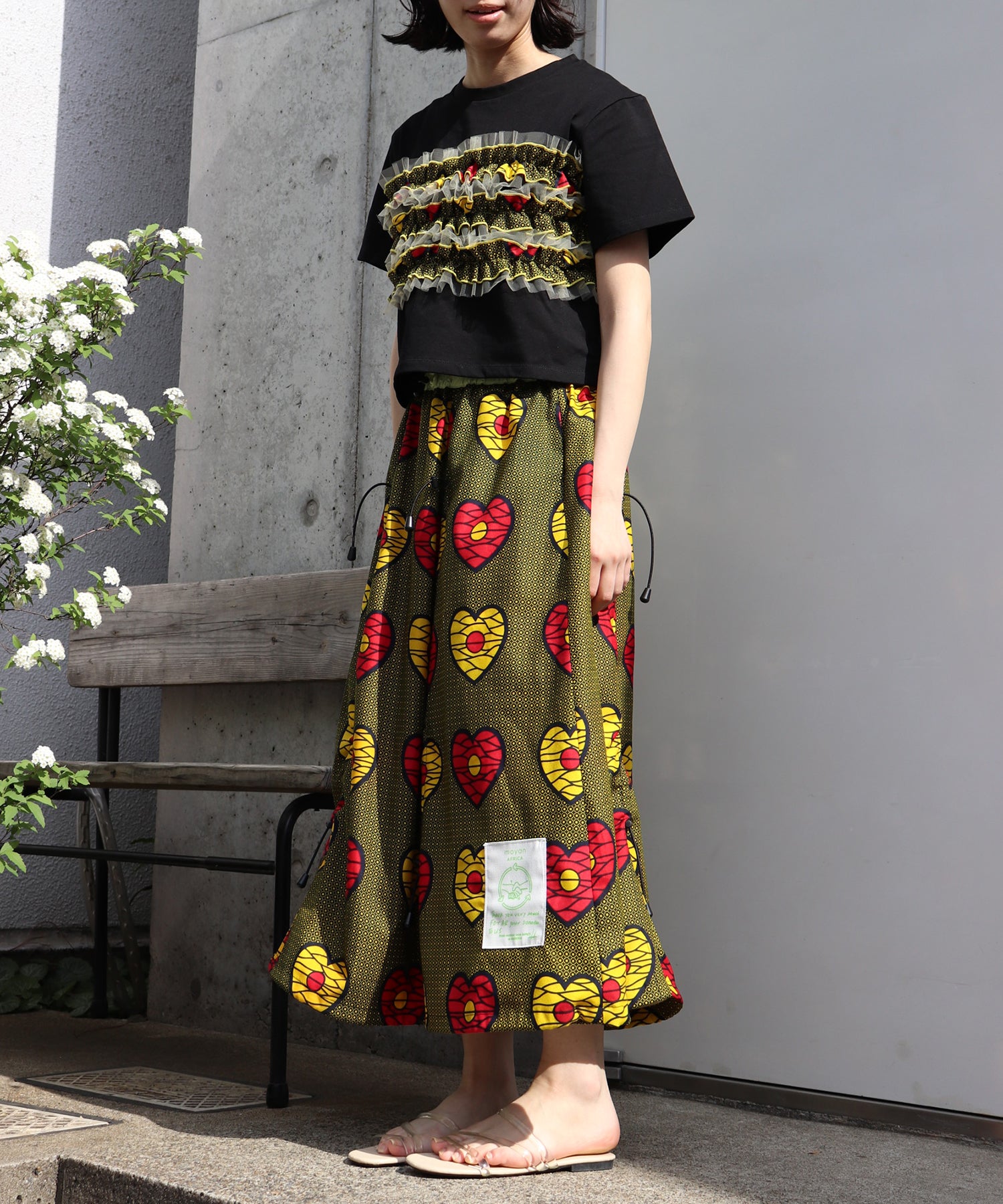アフリカンファブリックにチュールを重ねて身頃にたたき付けていて、かわいさが詰まったこの夏にオススメのTシャツです!